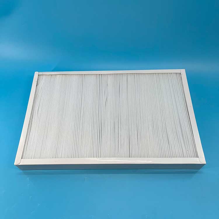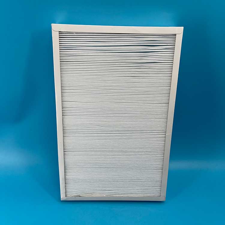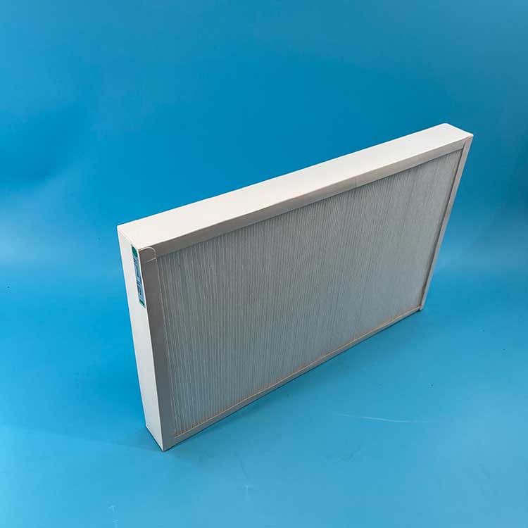 過濾材料是以折疊形式裝入高強(qiáng)度模切硬紙板內(nèi),迎風(fēng)面積增大。流入的空氣中的塵埃粒子被過濾材料有效阻擋在褶與褶之間。潔凈空氣從另一面均勻流出,因此氣流通過過濾器是平緩和均勻的。視過濾材料不同,它所阻擋的粒徑從0.5μm到5μm而不同,過濾效率也不同 。