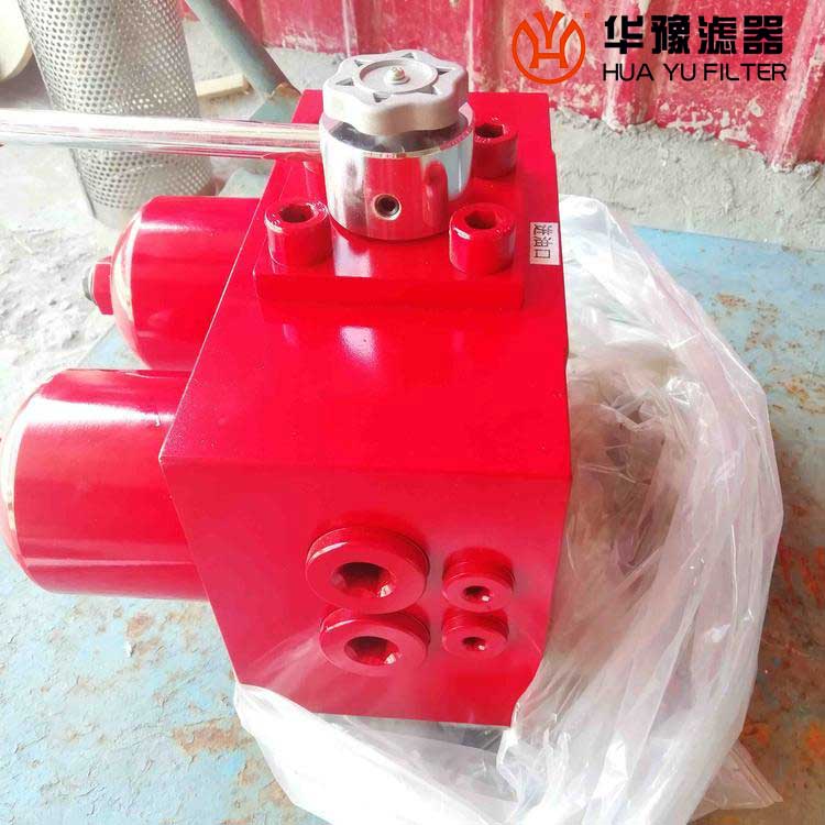 它的工作特點(diǎn)是當(dāng)一只過濾器濾芯堵塞需要更換時(shí),不需要停止主機(jī)工作,只要打開壓力平衡并轉(zhuǎn)動(dòng)換向閥,另一只過濾器即可參加工作,然后更換已堵塞的濾芯。